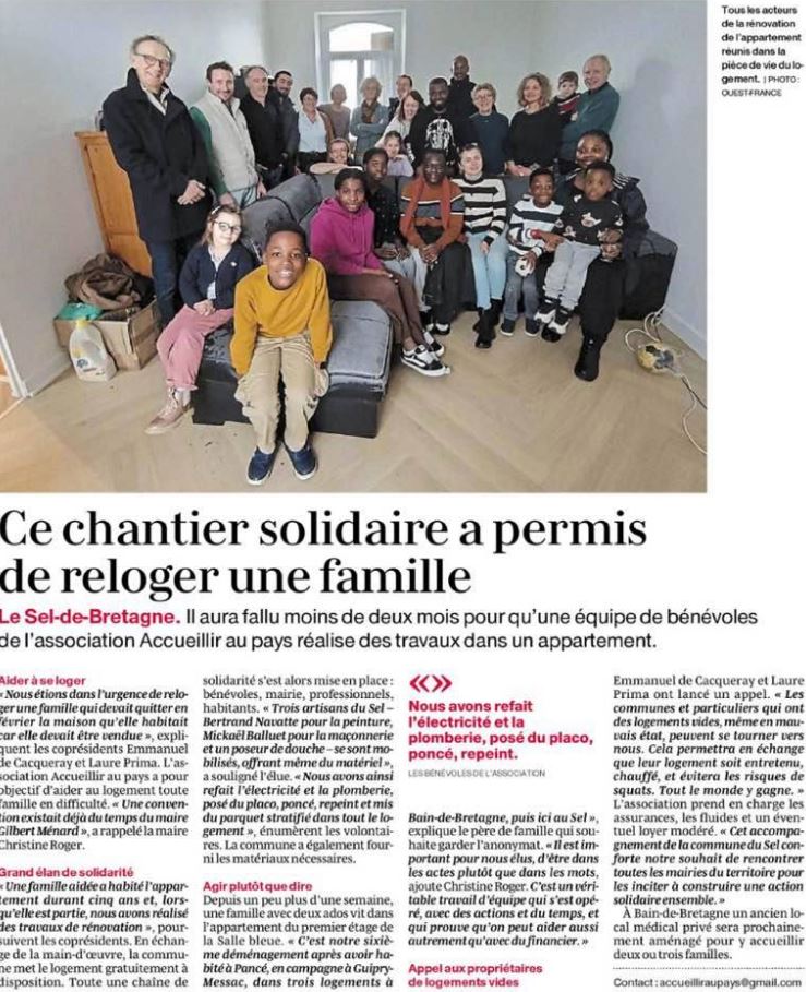 La commune du SEL de BRETAGNE et l'association ACCUEILLIR AU PAYS, se sont mobilisés pour rénover un logement permettant d'accueillir une famille en difficultés. Des artisans du Sel, la municipalité et des bénévoles ont permis de remettre en état un logement mis à disposition par la Mairie ......